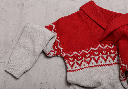 Winter warm woolen sweaters folded in a stack. Grey background copy space and empty place for your products. Cold time