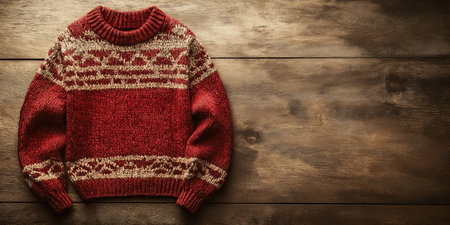 A red rustic knitted sweater with traditional patterns, placed on a wooden surface