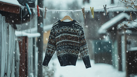 Generative AI Image of Warm Sweater Hanging on Snowy Clothes Line at Winter Snowfall Season