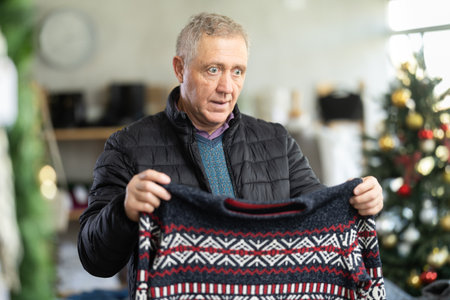 Attentive mature man choosing sweater in clothing store