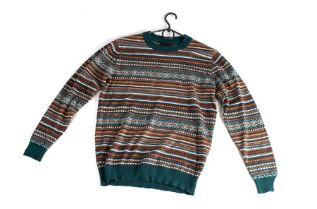 colored sweater with green, orange and brown colors. long sleeve patterned jumper isolated on white background
