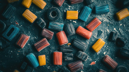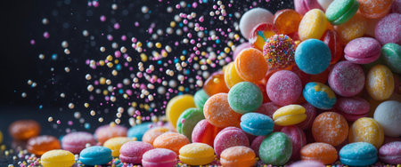A vibrant collection of assorted candy pieces scattered on a dark surface. The colorful sweets offer a delightful visual treat, perfect for food-related themes.