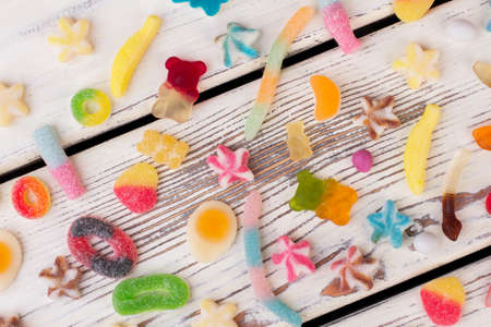 Assorted gummy candies. Top view. Jelly sweets.