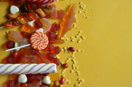 candies with jelly and sugar. colorful array of different childs sweets and treats on yellow background. red marmalade in the shape of a heart with a variety of caramels and candies, marshmallows. Abstract. top view copy space.