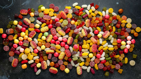 Colorful gummy candies on dark background. Top view.