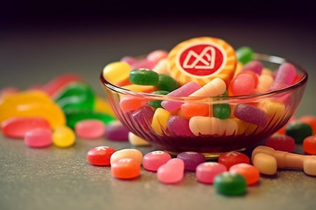 Colorful gummy candies piled against a vibrant rainbow backdrop