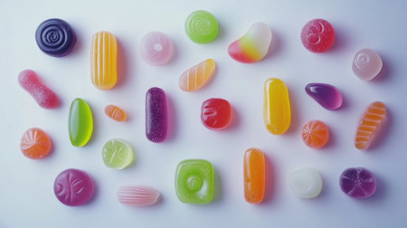 Jelly candies of different shapes and colors arranged playfully on a white surface, highlighting their vivid tones.