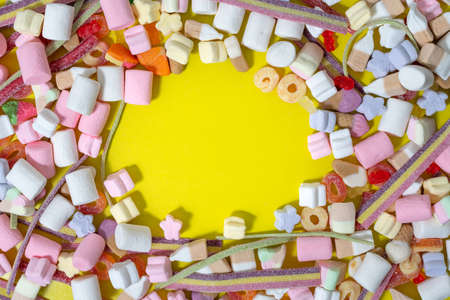 Colorful assortment of candies in shape of frame on yellow background. top view, copy space