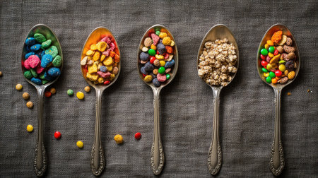 This captivating image features an array of colorful breakfast cereals elegantly arranged in vintage spoons atop a textured background, perfect for food lovers.