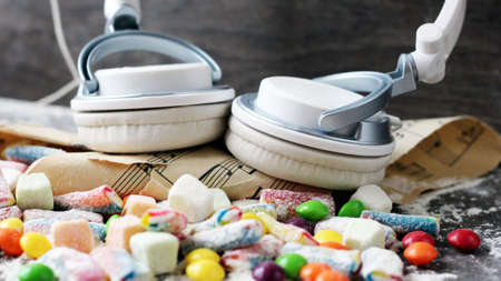White headphones and delicious marmalade of different colors, music