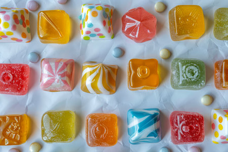 AI Generated. Colorful Glazed Cubes of Chewy Candy on White Surface for Sweet Treats