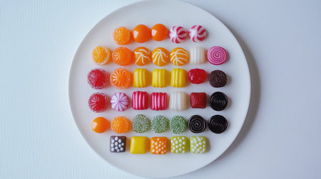 A neatly arranged assortment of hard candies with different shapes and colors, displayed on a white plate to highlight their vibrant and playful nature.