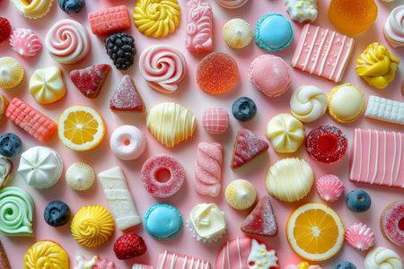 AI Generated. Colorful candy sweets arranged on a pastel pink surface