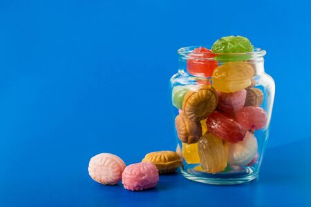An assortment of colourful, festive sweets, blue marmalade in the shape of a heart on a blue background with a variety of caramels and candies, marshmallows. Abstract background. top view copy space.