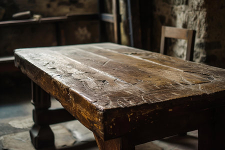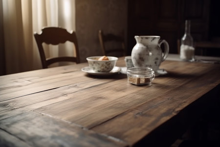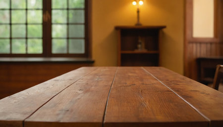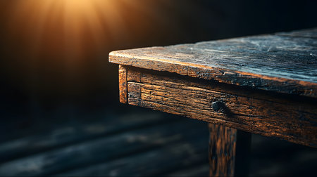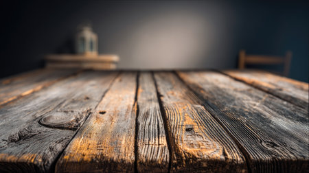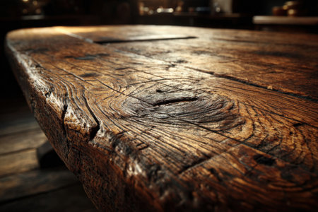 Closeup view of a rustic wooden table with a warm, inviting texture and soft lighting