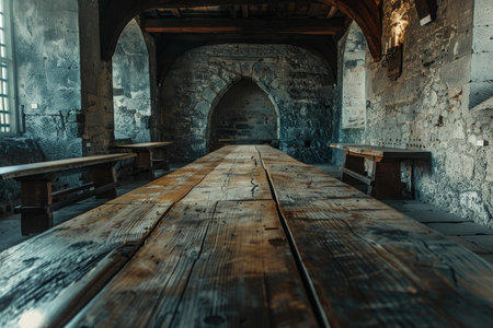Rustic medieval dining room with long vintage wooden table and ambient lighting