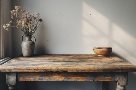 Rustic wooden table against a minimalistic white wall, perfect for displaying decor items or creating a cozy dining atmosphere. Versatile and stylish furniture piece.
