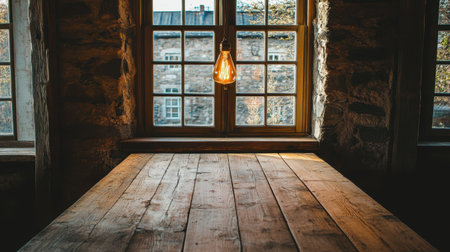 This image captures a cozy interior scene featuring a rustic wooden table illuminated by a vintage light fixture, framed by stone walls and large windows.