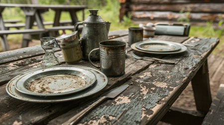 A weathered camp table set with tin plates and enamel mugs. The table is old and has a rustic look to it