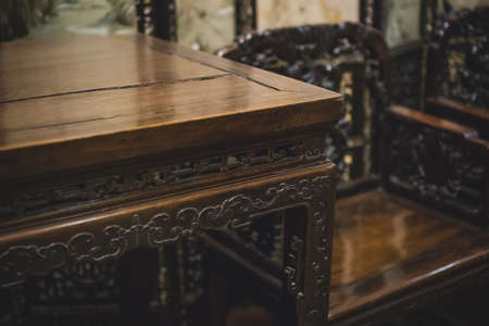 Wooden table and chair in cafe or restaurant. Selective focus.