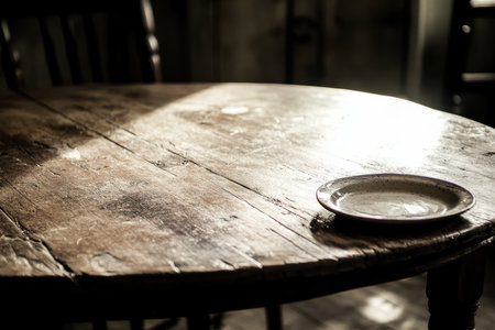 A solitary plate sits on a rustic wooden table, bathed in soft light.
