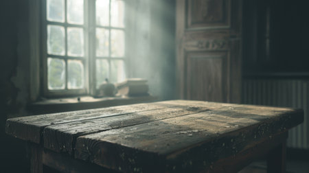 Sunlight illuminating rustic wooden table in vintage room with dust particles and old books.