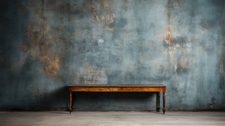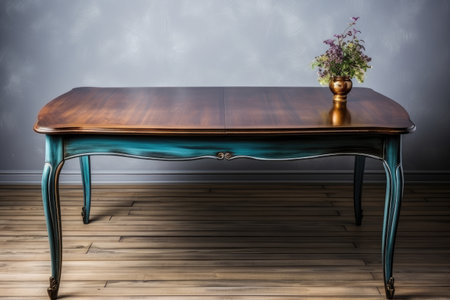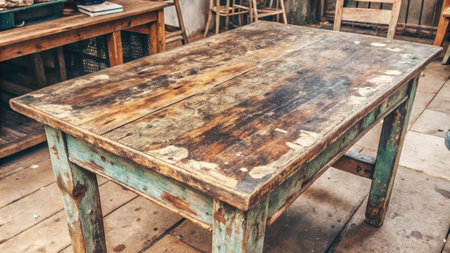 an old wooden table with loose paint application, showcasing a unique blend of light navy and brown colors. this captivating photo, taken with a nikon d750 and sony fe 12-24mm f2.8 gm lens, exudes an industrial vibe reminiscent of the barbizon school. the table's design transports us to edo-period japan, adding a touch of historical charm to the composition. ai generated