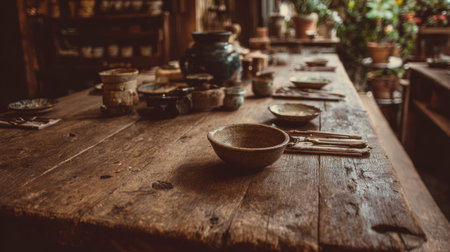 This image showcases a rustic workshop with a large wooden table, bathed in natural light, highlighting the tools and warm atmosphere of a creative workspace.