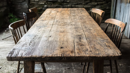 This rustic wooden table, crafted from weathered timber beams, exudes farmhouse charm with its earthy finish and simple design Perfect for outdoor settings, it showcases the natural beauty of wood with its warm tones and distressed texture Embrace country living and cozy atmosphere with this striking, sustainable piece AI Generative
