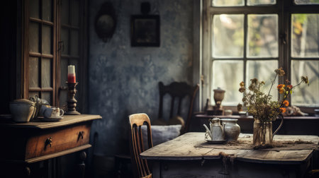 nostalgic blurred old home interior illustration cozy dreamy, charm soft, worn wooden nostalgic blurred old home interior