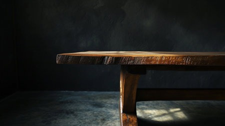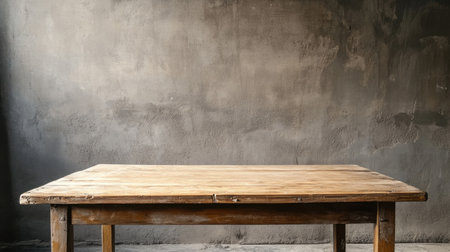 A rustic wooden table showcases its natural beauty against a textured gray wall. This inviting scene highlights craftsmanship and minimalism, perfect for interior decor.