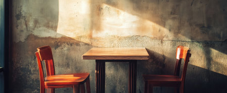A cozy wooden dining table with two chairs bathed in warm sunlight, set against a rustic wall. This inviting interior creates a tranquil atmosphere for quiet moments.