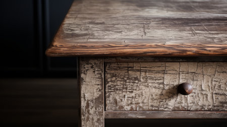 a captivating close-up of a vintage spandex end table, highlighting its unique imperfections, with visible grain, cracks, and peeling paint, revealing its charming rustic character. ai generated