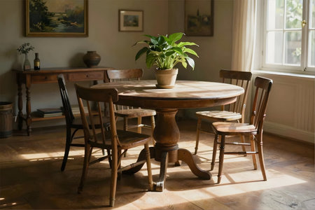 A beautiful rustic wooden table illuminated by soft sunlight creates a warm, inviting atmosphere in a cozy dining room, perfect for gatherings.
