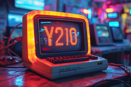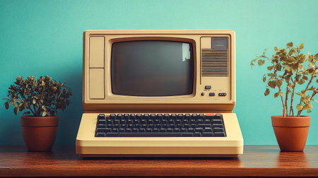 This vintage computer features a classic design with an old-fashioned keyboard and monitor, set against a contemporary backdrop, reflecting technological evolution.