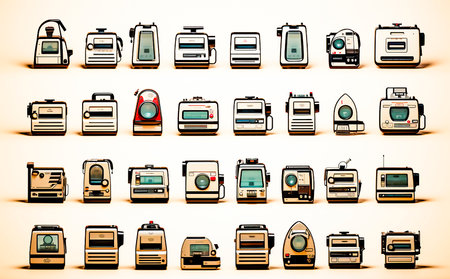 A captivating flat lay of various vintage electronic devices, featuring an array of colors, designs, and machinery. Perfect for technology enthusiasts.