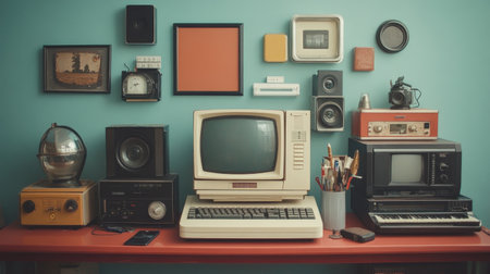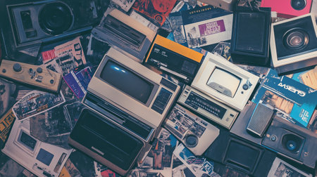Top angle shot of old electronic gadgets and communication devices, evoking nostalgia and history in technology. A.I.