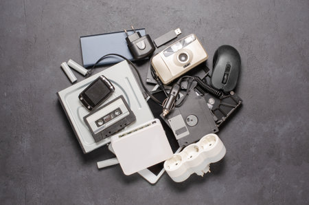 Old electronic devices on a dark background. The concept of recycling and disposal of electronic waste. Copy space
