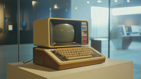 This image captures a vintage personal computer, beautifully displayed in a modern exhibition space, highlighting the evolution of technology over time.