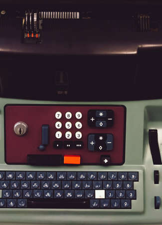 A closeup shot of the keyboard of a machine, including the numbers and letters