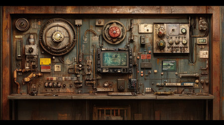 This detailed vintage machinery illustration combines graphic design elements in a unique layout. The composition features intricate tools and gauges, set against a creative backdrop.