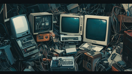A captivating scene showcasing a chaotic collection of vintage technology, featuring old computers, tangled wires, and nostalgic devices.