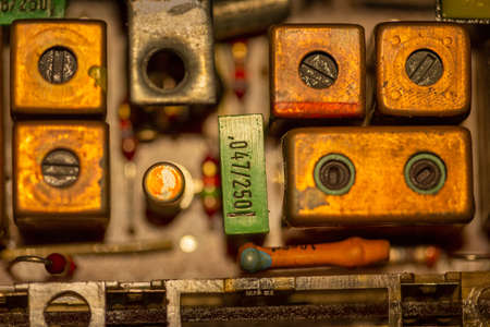 old tube chips with vintage transistors and resistors. small focusing area, selective focus. top view