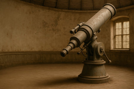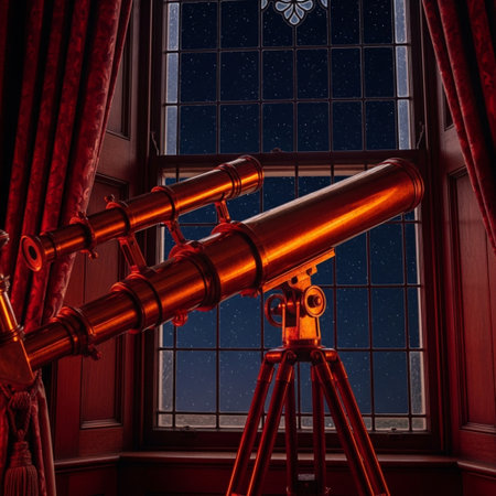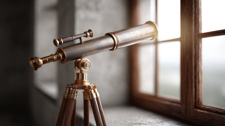Vintage brass telescope on a wooden stand by a window, no people, ample space for copy text