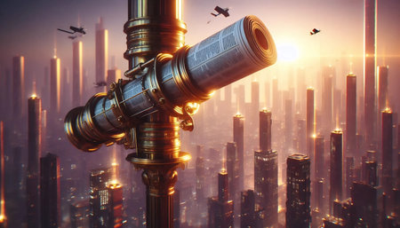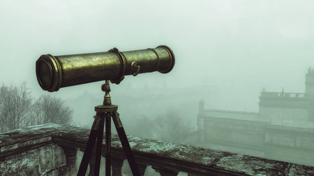 An antique telescope rests on a foggy rooftop, offering a unique perspective of a mysterious urban landscape shrouded in mist, evoking a sense of exploration.