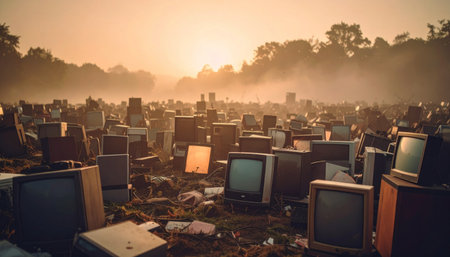 Piles of discarded vintage TVs at a dump, symbolizing technological obsolescence and waste