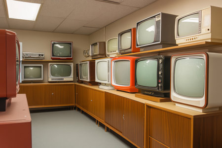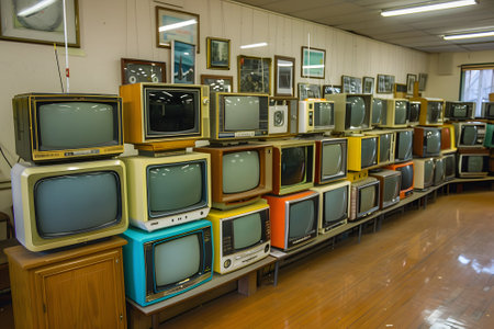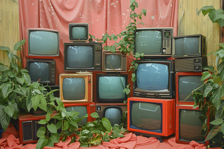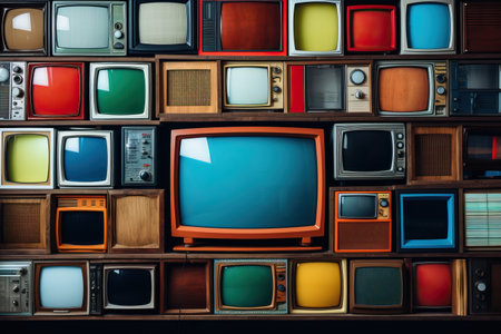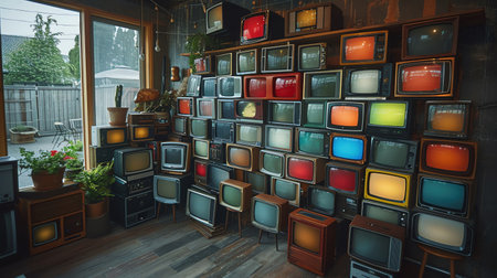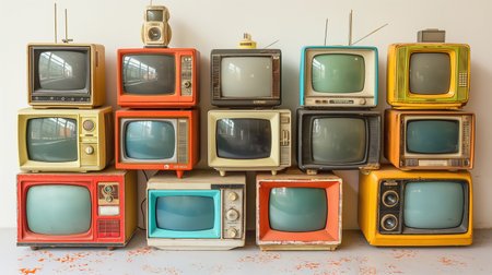 Explore a vibrant assembly of retro televisions in a colorful home setting capturing nostalgic vibes.