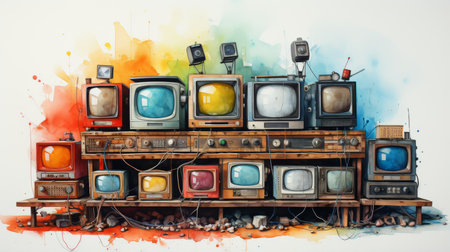 A captivating arrangement of vintage televisions displaying colorful glitch effects. This artistic composition offers a nostalgic touch to your creative projects.