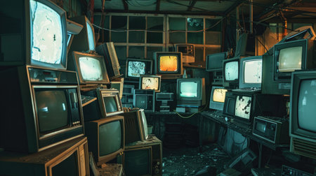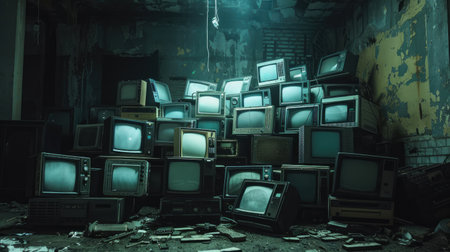 Abandoned room filled with old CRT monitors, dimly lit to symbolize electronic waste and technology's impact. --ar 16:9