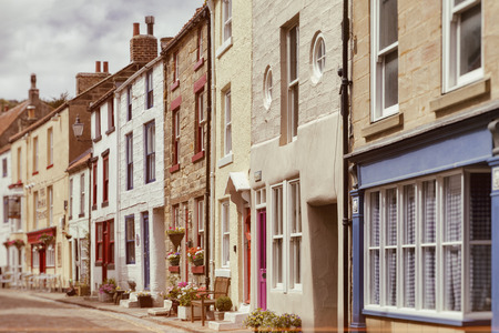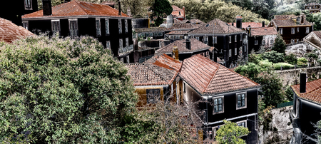 Shingle roofs and blocks street combined with flowers, historical center. Trees on the back in sepia filter